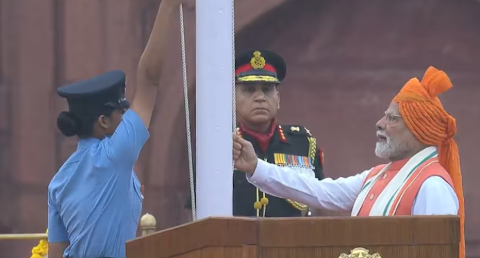 আজ ৭৮তম স্বাধীনতা দিবসে লালকেল্লায় জাতীয় পতাকা উত্তোলন করলেন প্রধানমন্ত্রী নরেন্দ্র মোদী। আকাশে বায়ুসেনার দুটি হেলিকপ্টার থেকে পুষ্পবৃষ্টি হয়। এরপর প্রতি বছরের মতোই প্রধানমন্ত্রী জাতির উদ্দেশ্যে ভাষণ দেনা।