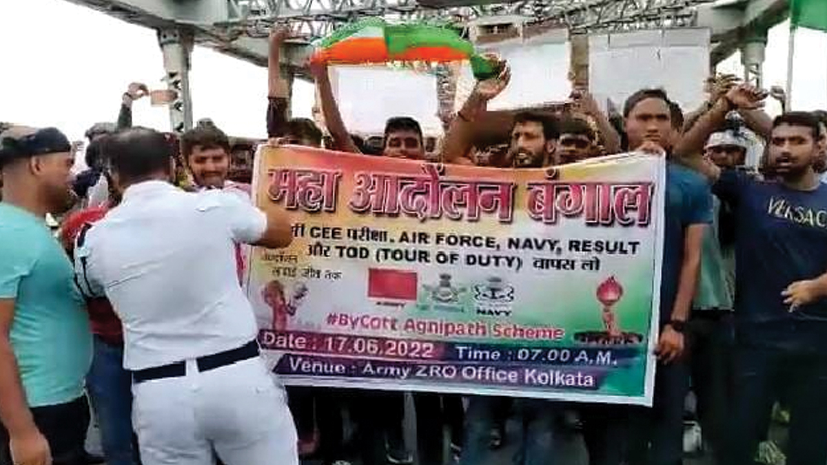 ‘অগ্নিপথ’ নিয়োগ নিয়ে ক্ষোভের আঁচ পশ্চিমবঙ্গে। বৃহস্পতিবার ভাটপাড়ায় প্রতিবাদের পর শুক্রবার সকালে উত্তর ২৪ পরগনার ঠাকুরনগর স্টেশনে রেল অবরোধ। তার জেরে শিয়ালদা-বনগাঁ শাখার আপ এবং ডাউন লাইনে ট্রেন চলাচল ব্যাহত হয়েছে। কেন্দ্রীয় সরকারের এই প্রকল্পের বিরোধিতায় এবার হাওড়া ব্রিজ অবরোধ করে বিক্ষোভে সামিল যুবকরা। শুক্রবার সকালে হাওড়া ব্রিজে প্রতিবাদ কর্মসূচি নিয়ে রাস্তায় নামেন বিক্ষোভকারীরা। দুর্ভোগে পড়েন অফিসযাত্রীরা। বিক্ষোভ আটকাতে লাঠিচার্জ করে পুলিশ।