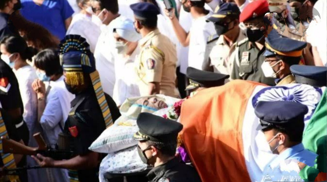 শেষকৃত্যের আগে শেষযাত্রায় জাতীয় পতাকায় ঢাকা হয় শিল্পীর মরদহে। প্রয়াত শিল্পীর বাড়িতে উপচে পড়ে ভক্তদের ভিড়। শিল্পীকে শেষ শ্রদ্ধা জানাতে উপস্থিত হন বিশিষ্টরা। শেষযাত্রায় প্রয়াত শিল্পীর দেহ ঢাকা হয় তেরঙ্গা পতাকায়। হাতজোড় করে প্রণাম করে বিদায় জানান বোন আশা ভোঁসলে সহ গোটা পরিবার।