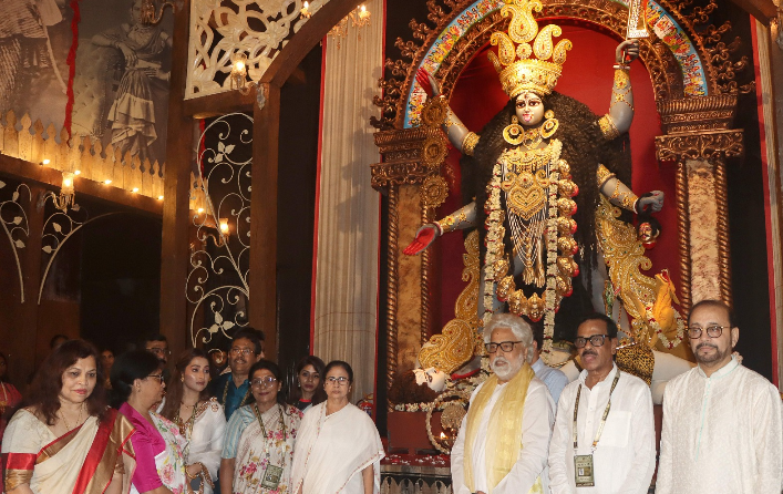 সোমবার গিরিশ পার্কে ফাইভ স্টার ক্লাবের কালী পুজো উদ্বোধনে মুখ্যমন্ত্রী। ছবি: রাজীব বসু