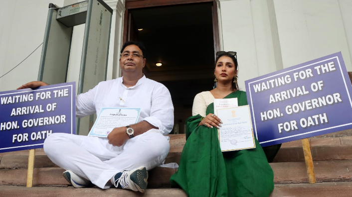 প্রথম পাতা খবর বিধানসভায় শপথ পাঠে এলেন না রাজ্যপাল, ধরনায় দুই নবনির্বাচিত বিধায়ক