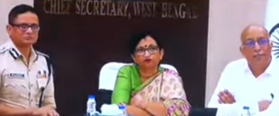 নবান্নে সাংবাদিক সম্মেলনে মন্ত্রী চন্দ্রিমা ভট্টাচার্য মুখ্যসচিব ও রাজ্যের ডিজি। ছবি: রাজীব বসু