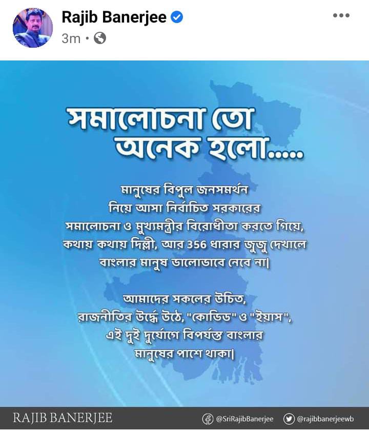 ফেসবুকে তিনি লিখেছেন, ‘কথায় কথায় দিল্লি, ৩৫৬ ধারার জুজু দেখালে চলবে না। ৩৫৬ ধারা জারির জুজু দেখালে ভালভাবে নেবে না বাংলা। বিপুল জনসমর্থন নিয়ে আসা সরকারের সমালোচনা, মুখ্যমন্ত্রীর বিরোধিতা করতে গিয়ে জুজু দেখালে চলবে না।’ রাজীব আরও লিখেছেন, ‘রাজনীতির ঊর্ধ্বে উঠে দুর্যোগ বিধ্বস্ত বাংলার পাশে থাকুন। সবার ইয়াস-করোনায় বিপর্যস্ত বাংলার পাশে থাকা উচিত।’