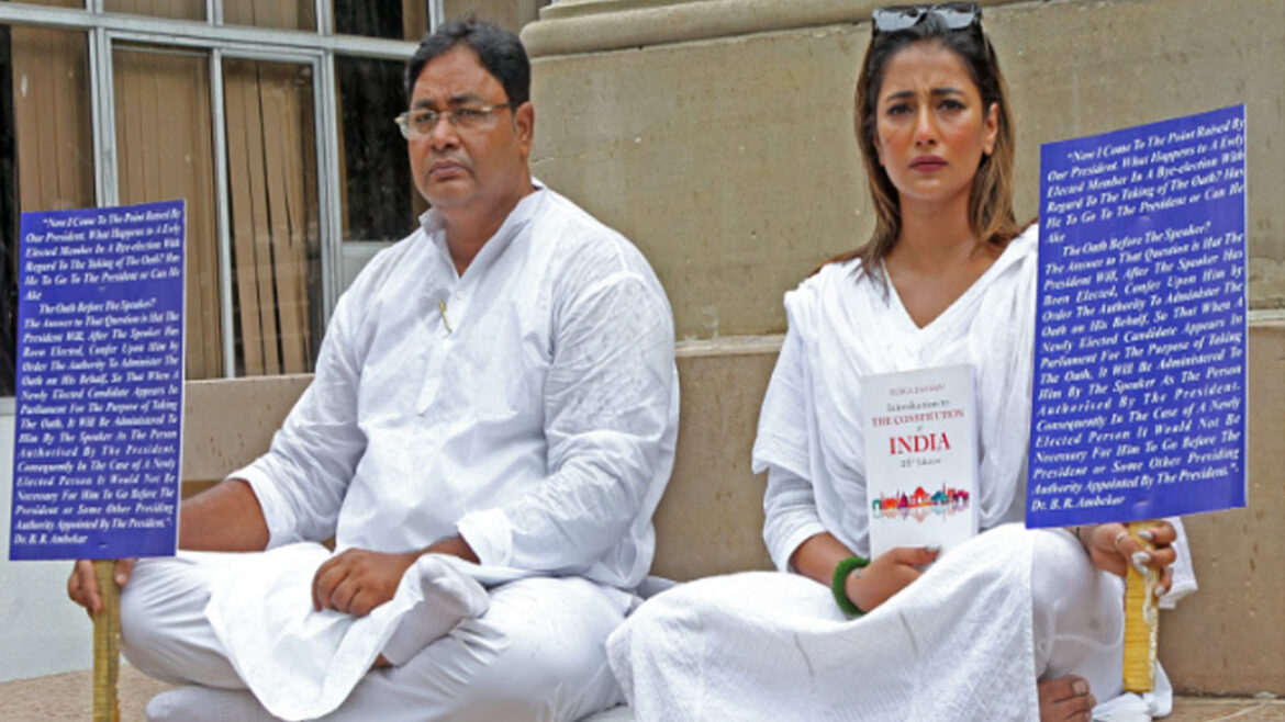 পাল্টা ওই দুই জয়ী তৃণমূল কংগ্রেস বিধায়ক বলছেন, বিধানসভাতেই তাঁরা শপথ নেবেন। তাই সেখানে আসুন রাজ্যপাল। কিন্তু রাজ্যপাল সিভি আনন্দ বোস তাঁর নিজের সিদ্ধান্তে অনড়। বুধবার বিধানসভার সিঁড়িতে হাতে প্ল্যাকার্ড নিয়ে ধর্নায় বসেছিলেন সায়ন্তিকারা। এদিন থেকে তাঁরা বাবাসাহেব ডঃ ভীমরাও আম্বেদকরের মূর্তির পাদদেশে ধর্না শুরু করেছেন। শপথগ্রহণ না হওয়া পর্যন্ত ধর্না চালিয়ে যাওয়ার কথা জানিয়েছেন তাঁরা।