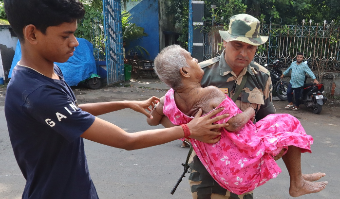 মানিকতলায় এক অশীতিপর ভোটারকে সাহায্য। ছবি: রাজীব বসু